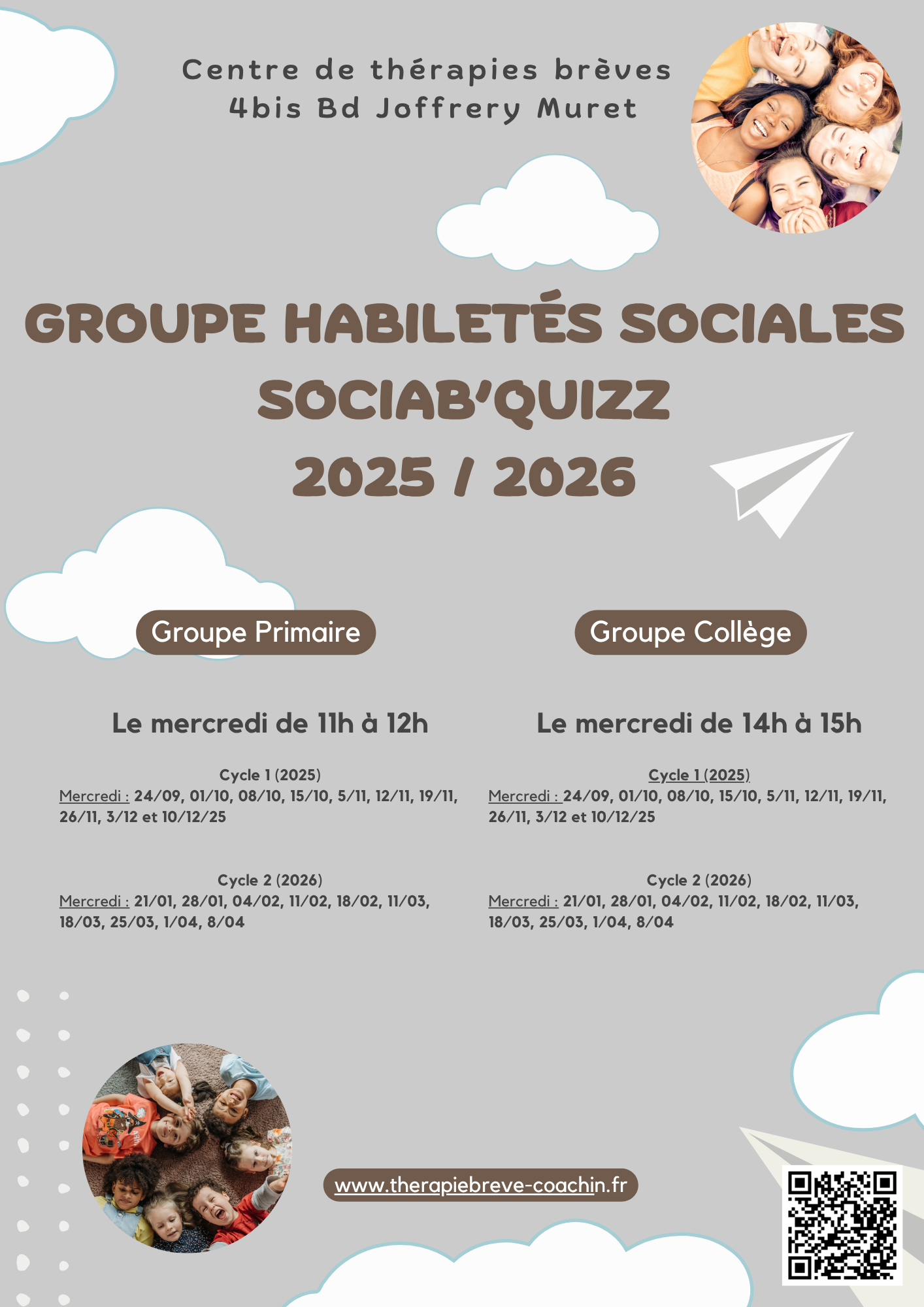 Le travail en groupe d’habiletés sociales est destiné aux enfants et adolescents de 7 à 17 ans, notamment ceux présentant des troubles du spectre autistique (TSA) ou des troubles du spectre de l autisme. Ces sessions visent à aider à surmonter des difficultés telles que l'anxiété sociale, le déficit de l’attention et d'autres troubles neurodéveloppementaux.